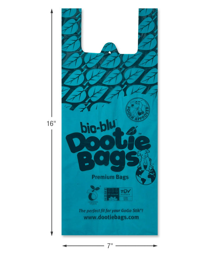 Need a better poop bag? Compare dimensions: 16" (long) x 7"(wide) x 5"( each side gusset), Volume: 1.5 gal. Looking for better bags? These Large Bio-Blu Dootie Bags are easy to use and hold a lot! Bio-Blu Dootie Bags are larger, strong, and leakproof and are specially designed to fit your GoGo Stik pooper scooper. Scoop pounds of poop in one bag to make your dog or pet waste waste scooping faster and less wasteful.
